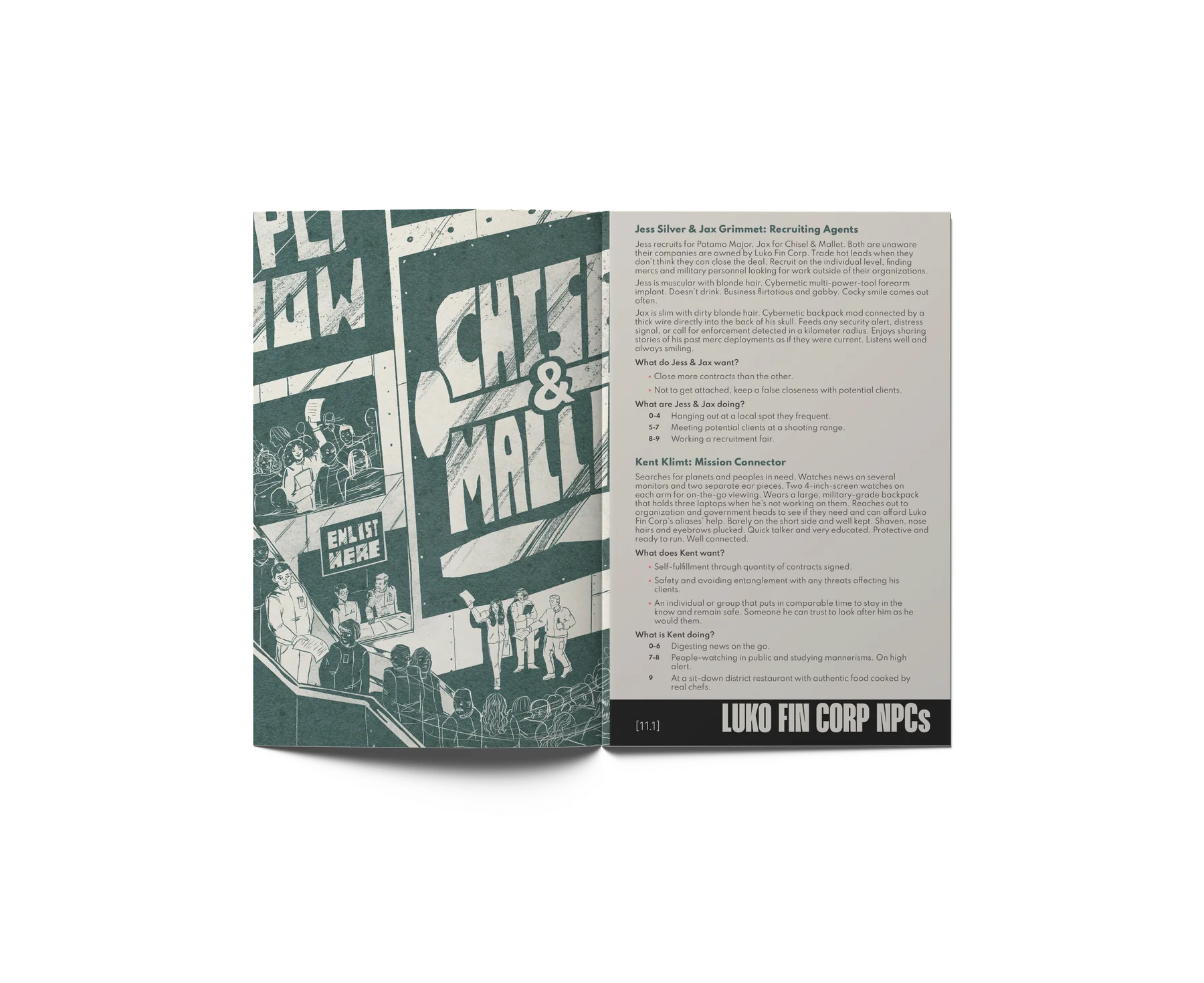 - The Mercenary Appendix including alternative loadout tables featuring weapons from Yucatan Tech Co, random downtime tables, eight mercenaries, and random mission tables for the three main mercenary corps.