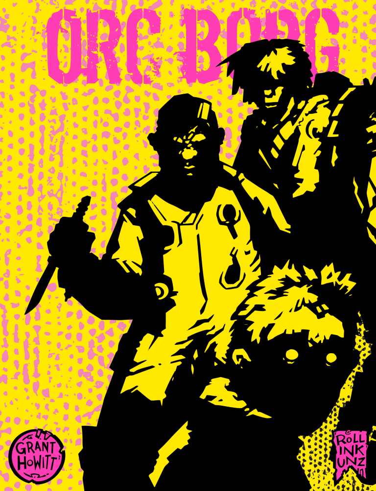 The game is written by Grant Howitt (Spire, Heart, Paranoia, Honey Heist) and illustrated by ROLLINKUNZ (Fragnarok, The Dungenerator, Goblinfinite); it’s RISOprinted in three colours, making it almost obviously vibrant. It’s loud, rude, abrasive and at points hard to look at directly, and we wouldn’t have it any other way.