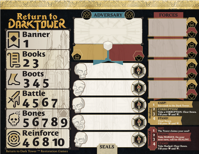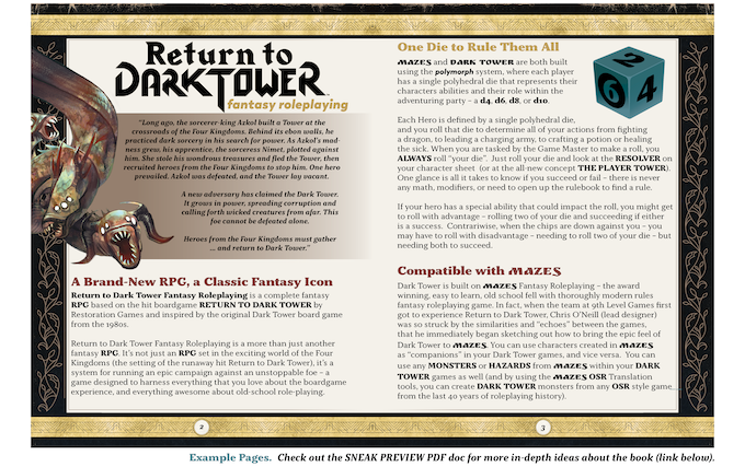 The Return to Dark Tower RPG is designed to be played over a series of 3 to 5 game sessions collectively called a `campaign`. During each campaign, the players create an ADVERSARY together (or choose one of the existing great evils – like the Bane of Omens or the Ash Strider). One player will take on the role of the ADVERSARY and will act as the Maze Controller, or MC the campaign`s game master. They will run the game sessions, and plot against the players using the resources laid out in the game manual to crush their puny heroes! The other players will each create a HERO and a COMPANION from one of the Four Kingdoms. Together, they will quest to assemble allies, armies, and artifacts of great power to aid their cause. They will take on quests and delve in dungeons to either build up their own power, or remove their enemies' advantages.