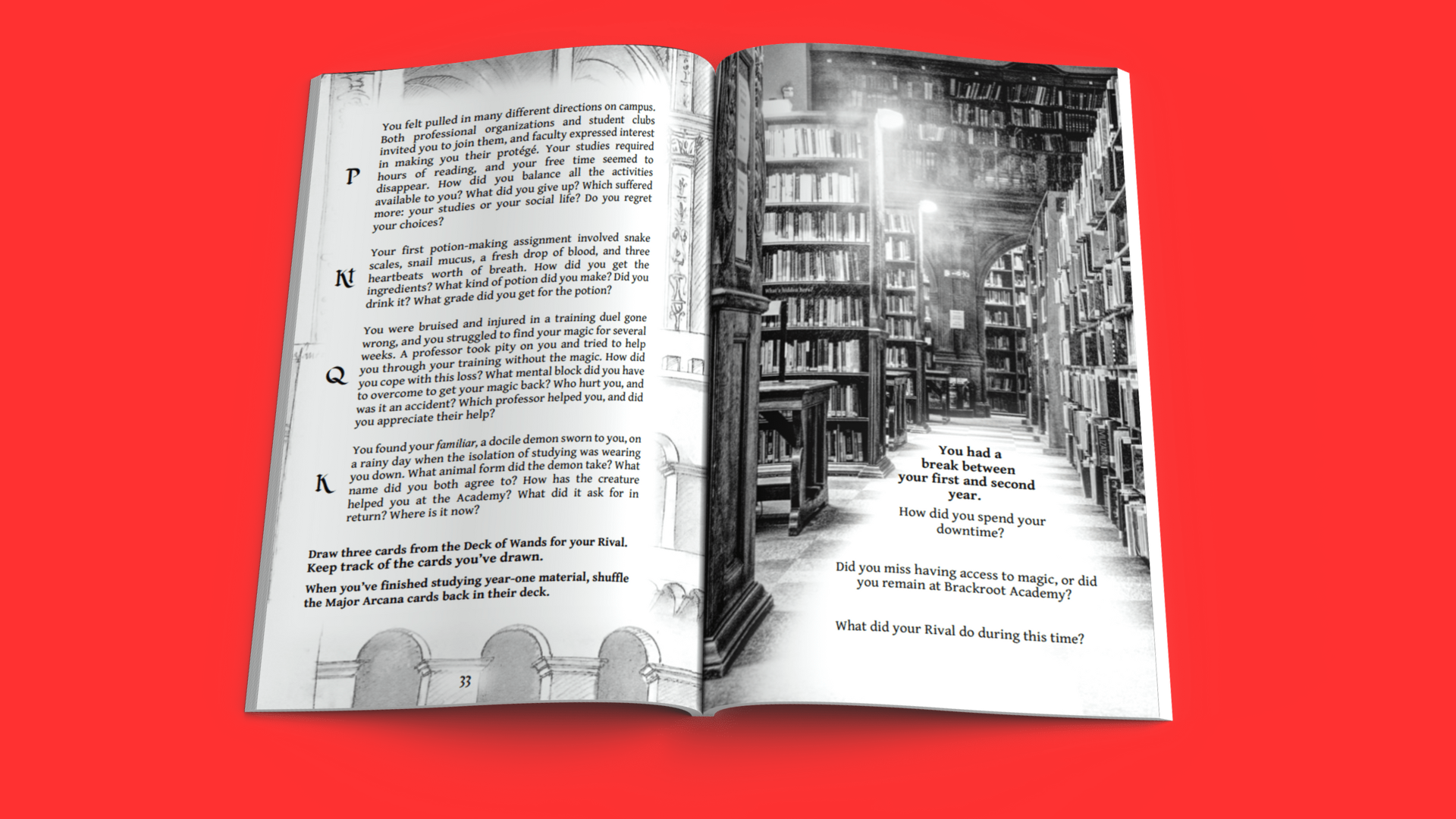 When you play with another person, you’ll take turns exploring what the Academy holds for you, adding to each other’s memories as you go. Just like in solo play, you’ll use a single tarot deck to uncover events where your characters cross paths.