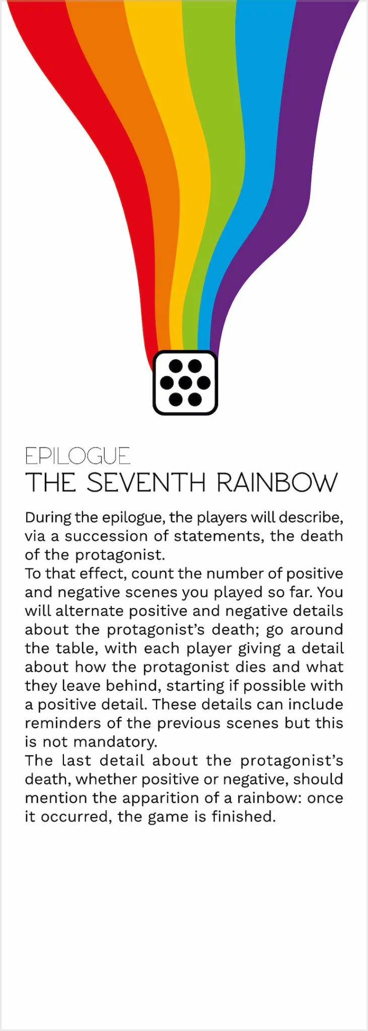 The Seventh Rainbow is GMless game in freeform narration, for 3 to 5 people in sessions of around 2 hours.