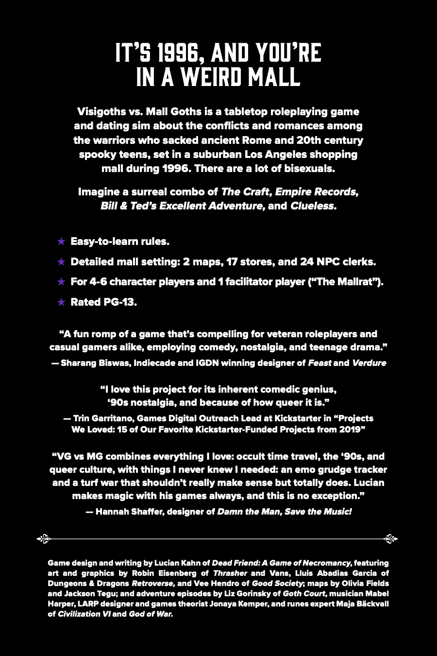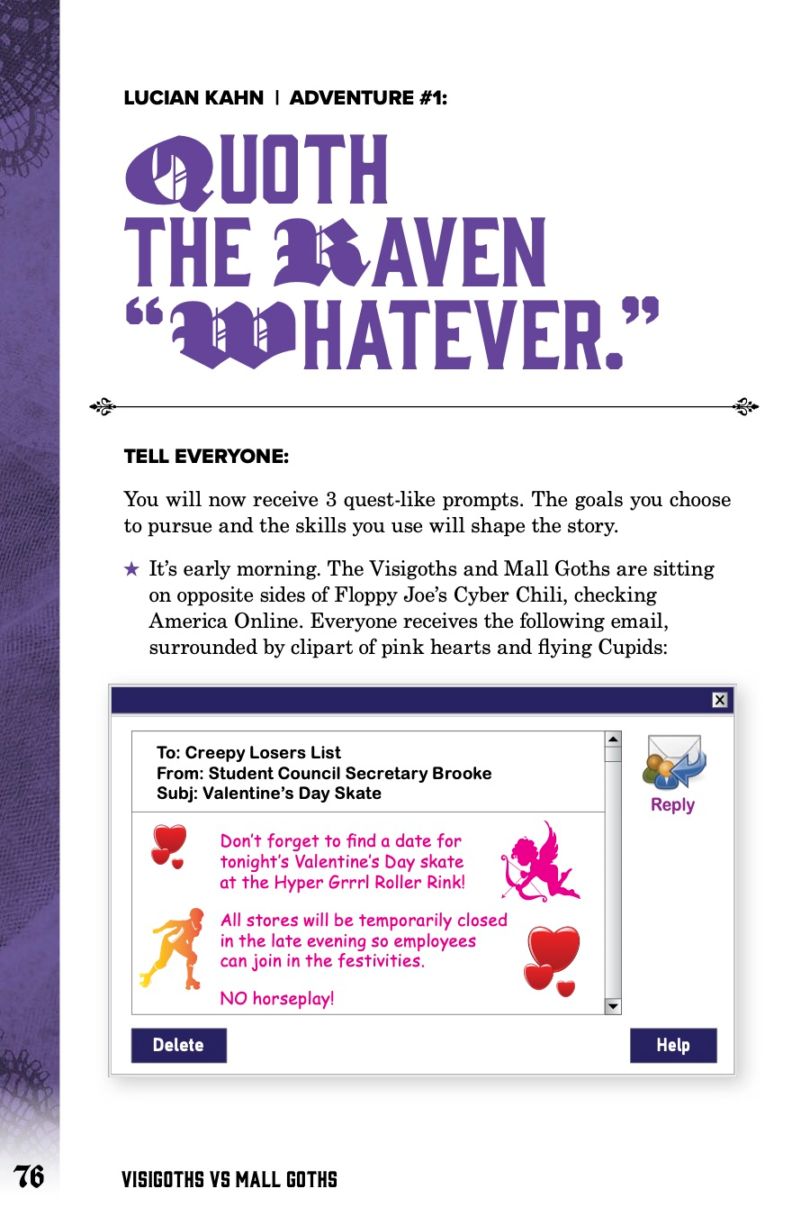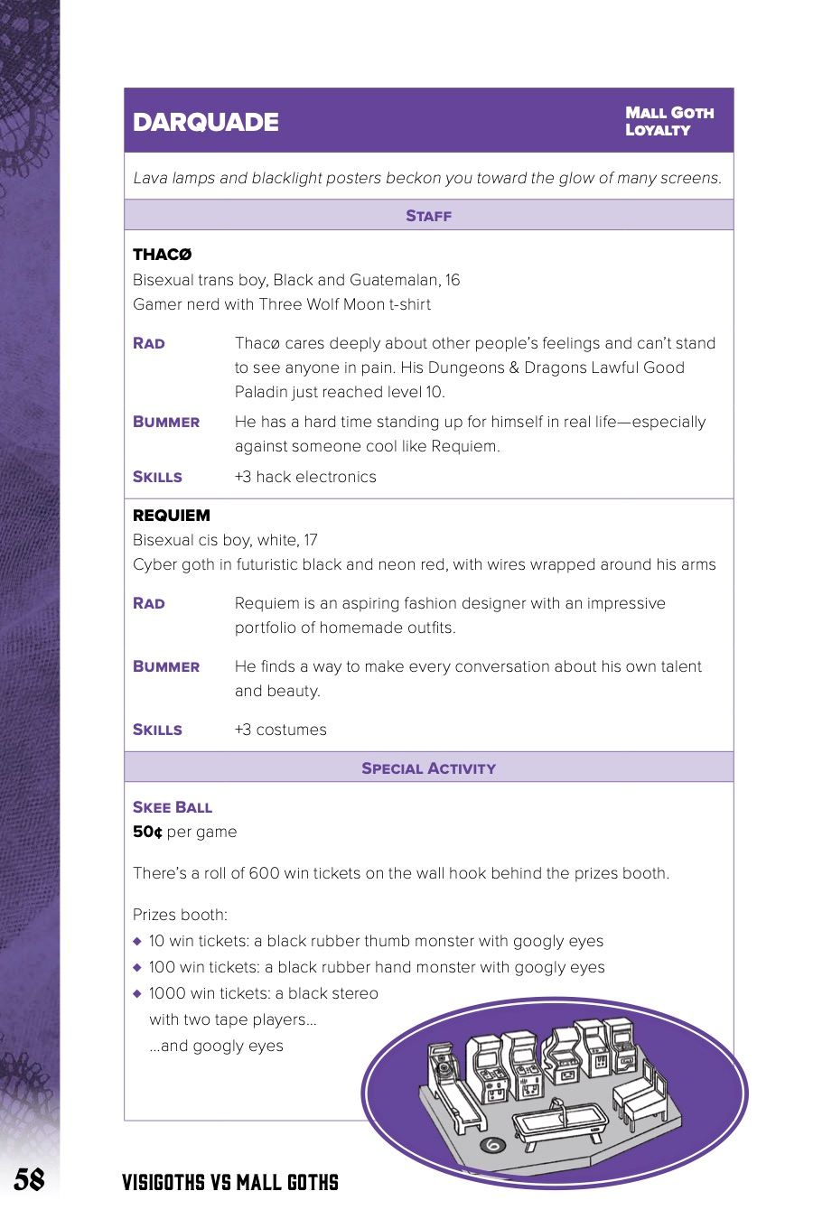 The plot structure of Visigoths vs. Mall Goths resembles an open-world videogame RPG. Designed for either one-shot or campaign play, each adventure episode offers several quests that you may choose to pursue (or ignore), and the mall setting is packed with many strange retro marvels to discover. Or you can just replay the game over and over to kiss all the kissable clerks.