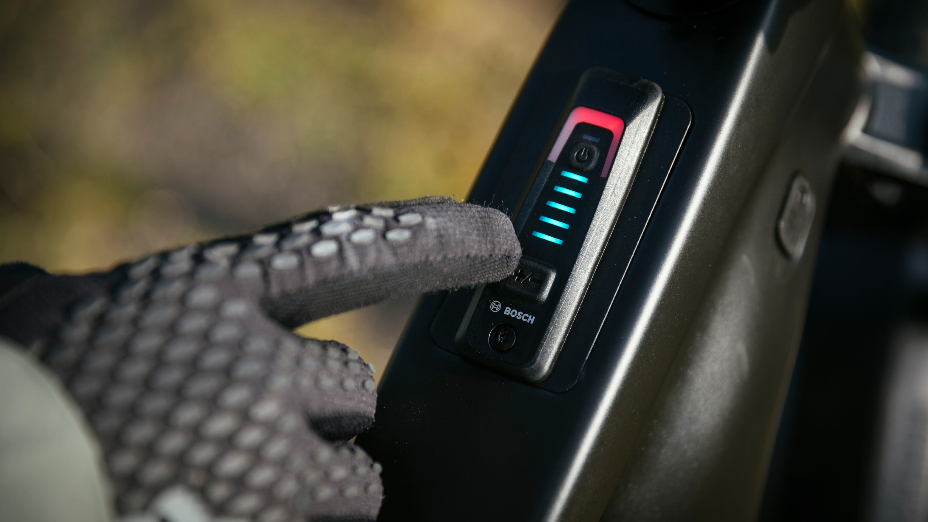The System Controller gives you a quick overview of your assist mode and battery level without distracting you from the ride. Its integrated into the top tube so its out of the way but still easy to see with LED indicators. It also connects to the eBike Flow app via Bluetooth for accessing ride stats and performing system updates.